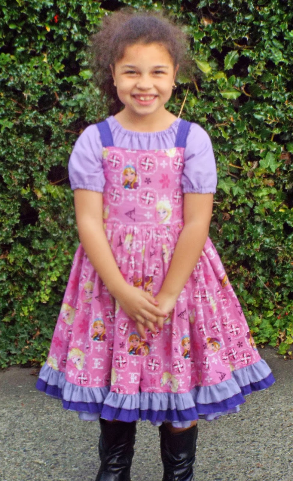 There was so much ruffling going on... And then I started with the outer dress. My daughter, like everyone else's daughter, loves Frozen so I have some of every Frozen print. She really wanted a Frozen twirly dress.I chose the open back with a double ruffle to mat h the underdress. After yards and yards of ruffles, I think she was pleased...
